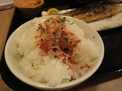セット内容はメインにご飯に味噌汁と小鉢、あとふりかけが付いてます。ご飯のお替りはOKなんだって☆ちなみに定食の味噌汁はプラス料金で貝汁や豚汁に変更することも可能みたいです。