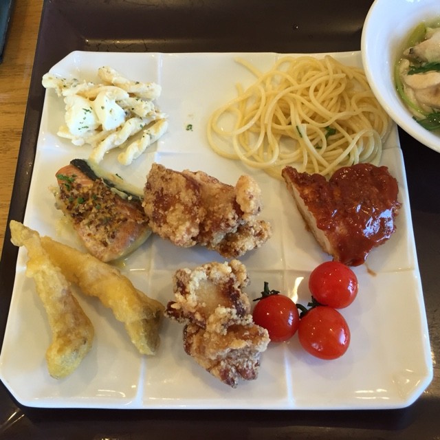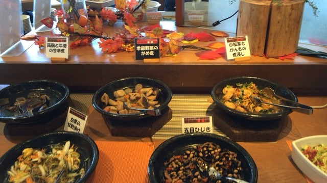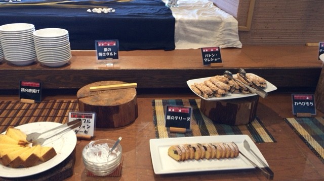 椅子の向こう側がアップで撮影していないもう一つのスイーツコーナーです。さてお料理、順番はほぼ頂いた順ですが、スイーツの後に蕎麦とカレーを頂きました。